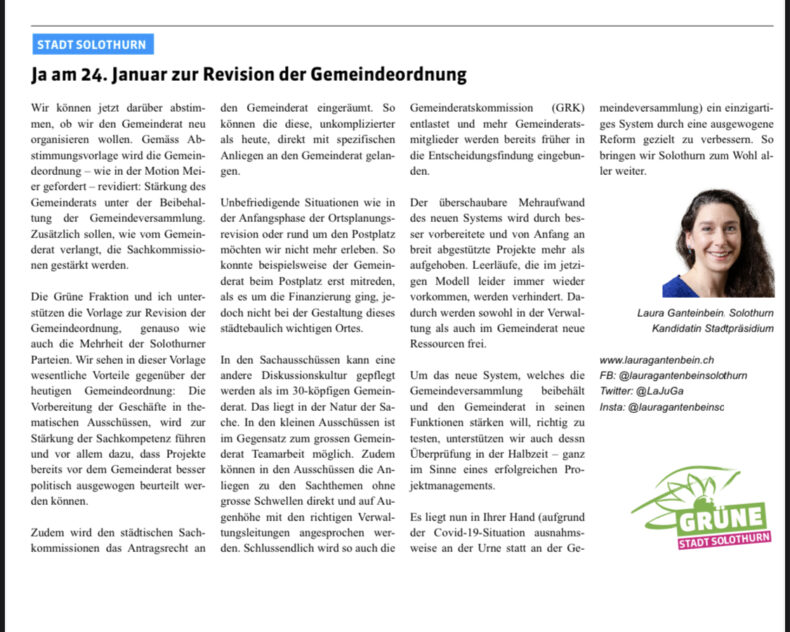 Die Grüne Fraktion und ich unterstützen die Vorlage zur Revision der Gemeindeordnung. Genauso wie auch die Mehrheit der Solothurner Parteien diese Reform befürworten. Wir sehen in dieser Vorlage wesentliche Vorteile gegenüber der heutigen Gemeindeordnung: Die Vorbereitung der Geschäfte in thematischen Ausschüssen, wird zur Stärkung der Sachkompetenz führen und vor allem dazu, dass Projekte bereits vor dem Gemeinderat besser politisch ausgewogen beurteilt werden können.